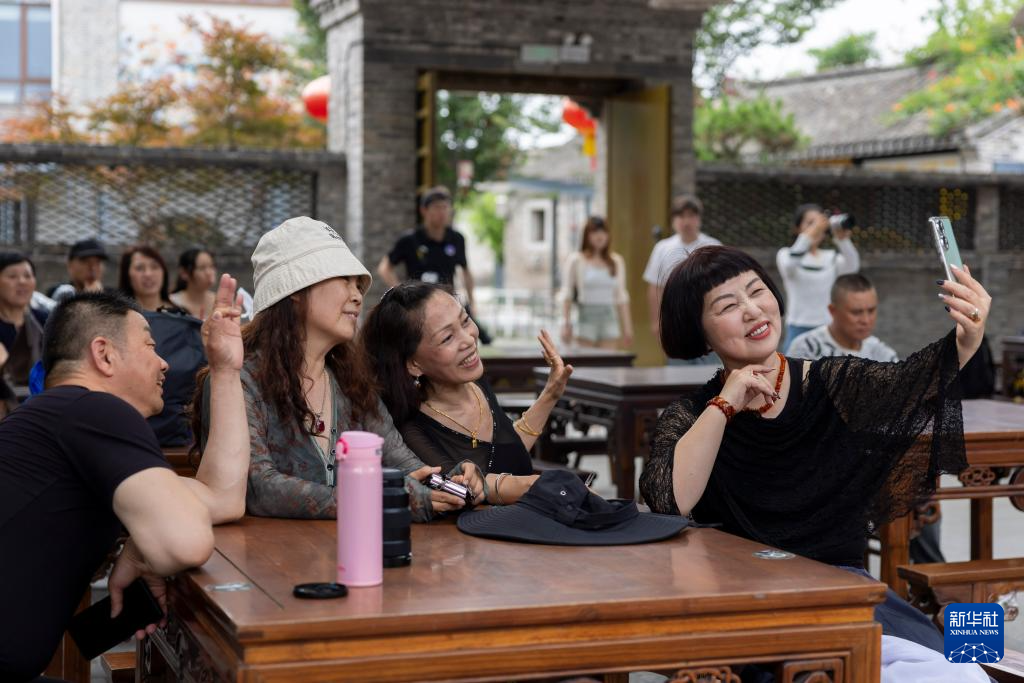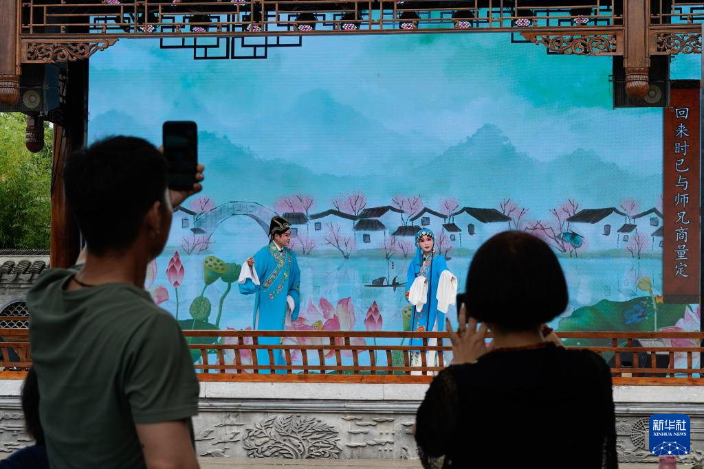 6月7日,觀眾在江蘇省鹽城市建湖縣淮劇小鎮拍照打卡。
