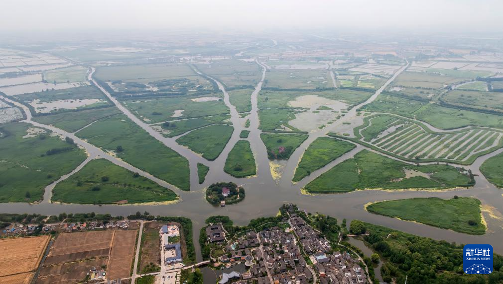 6月7日拍攝的江蘇省鹽城市建湖縣淮劇小鎮和九龍口國家濕地公園(無人機照片)。
