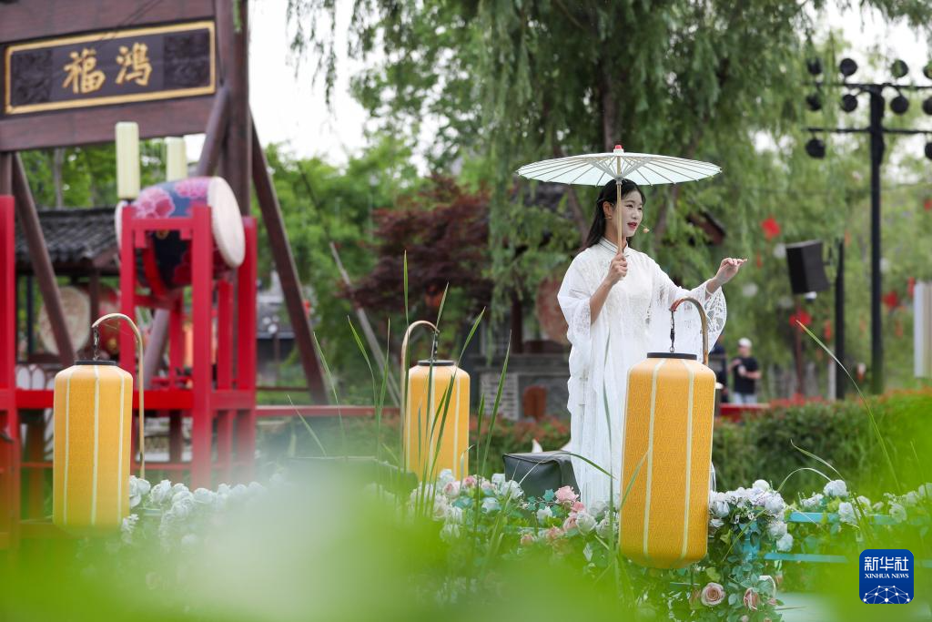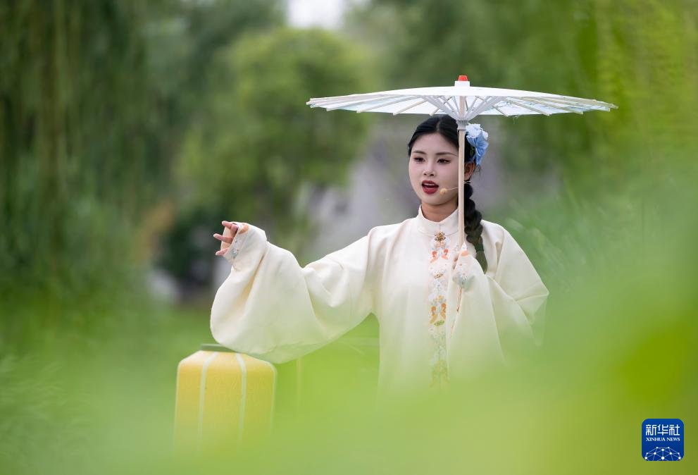6月7日,演員龔欣冉在淮劇小鎮一處小舞臺唱淮歌版《青花瓷》?;磩⌒℃偯刻於加邪儆嗝輪T分布在大戲院和小舞臺,為觀眾獻上精彩演出。