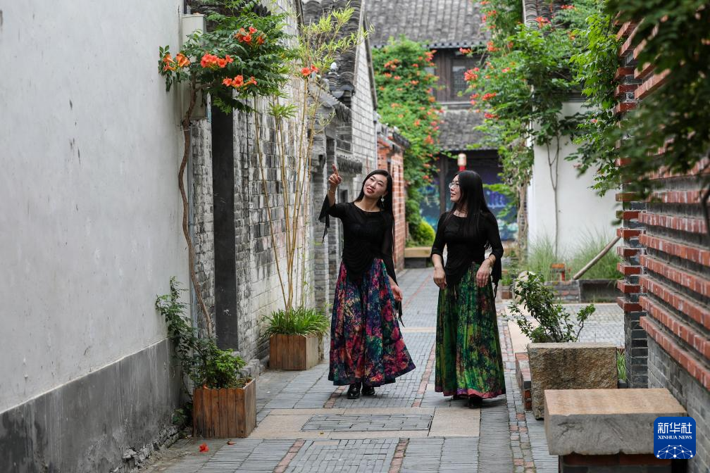兩名游客走過江蘇省鹽城市建湖縣淮劇小鎮沙莊戲苑(6月7日攝)。