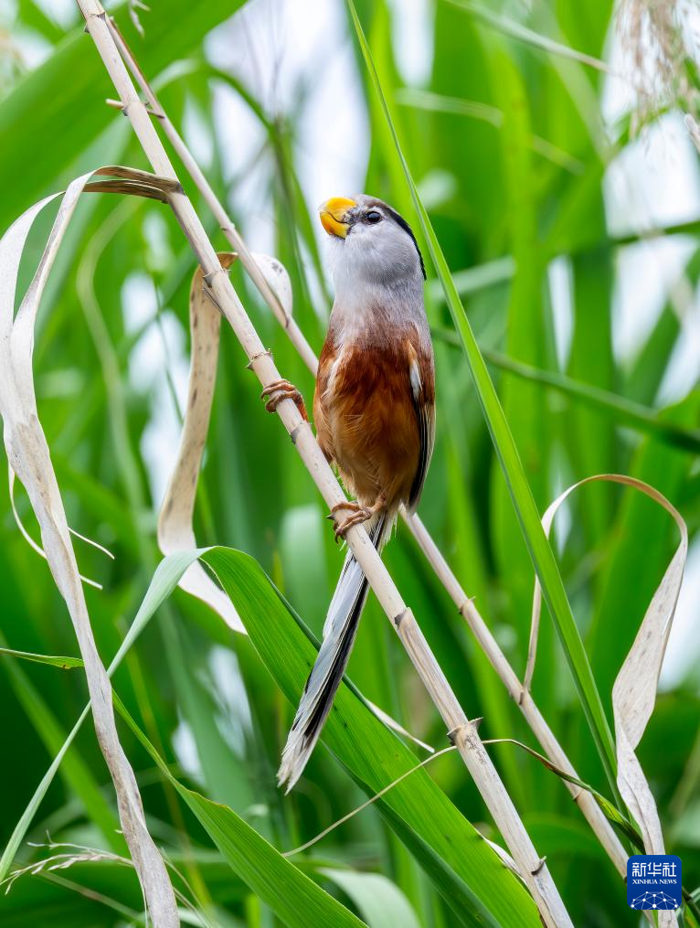 在九龍口國家濕地公園里,國家二級保護野生動物、“鳥中大熊貓”震旦雅雀在蘆葦叢中覓食(6月7日攝)。