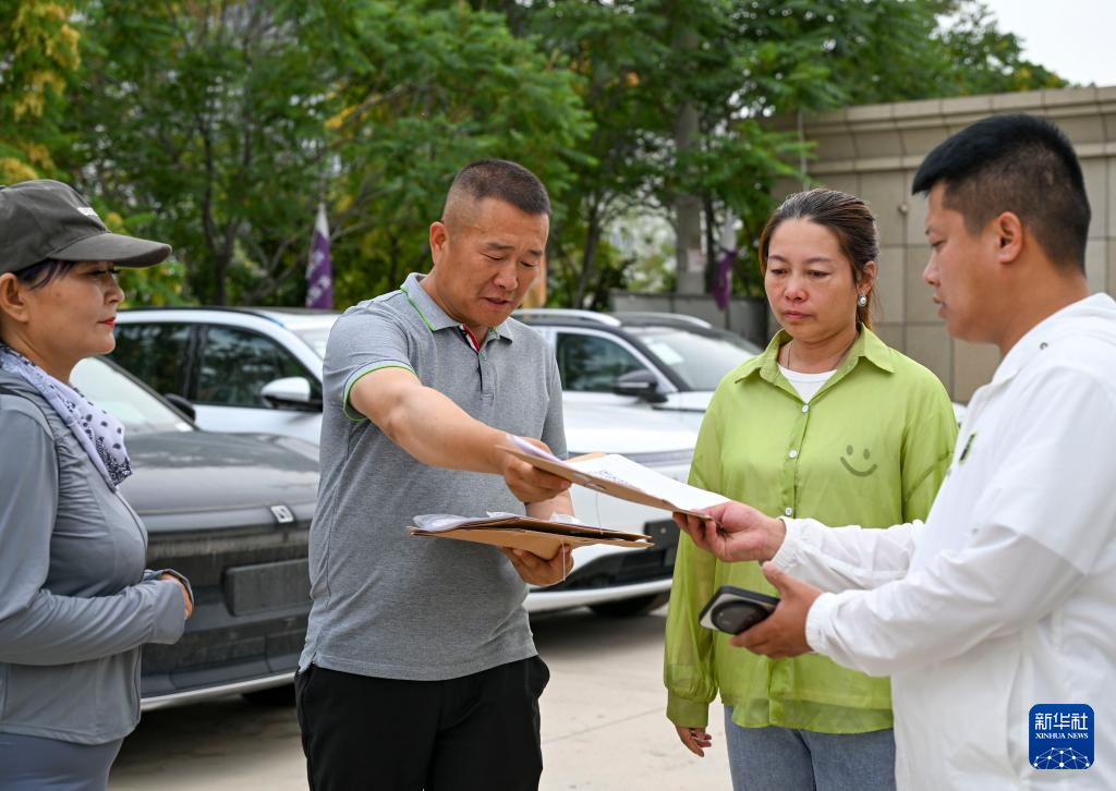 在新疆霍爾果斯一家汽車貿易公司,公司負責人(左二)向“擺渡人”發放車鑰匙和出關所需資料(6月10日攝)。