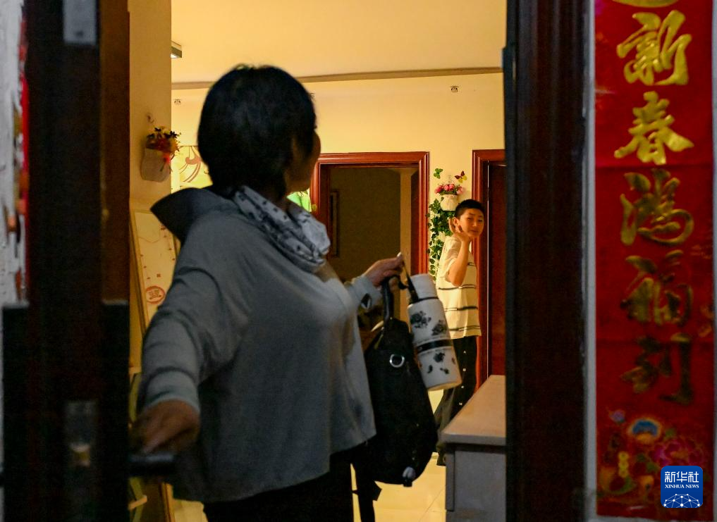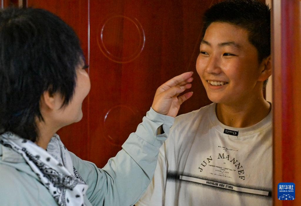 高云(左)在新疆霍爾果斯家中同兒子告別(6月9日攝)。這次運車出國的任務在晚上,她當天無法回家陪伴兒子。