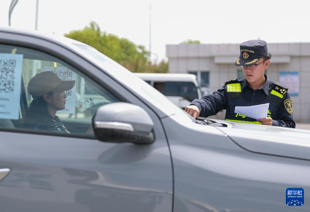 在新疆霍爾果斯公路口岸海關集中查驗場,霍爾果斯海關工作人員(右)查驗一輛由“擺渡人”駕駛出境的車輛的相關信息(5月28日攝)。2024年10月,霍爾果斯公路口岸正式施行“自駕出口商品車快速通關模式”,企業可以在線上生成包含車輛各類信息的二維碼,通關時享受“一掃即過”的便捷服務。