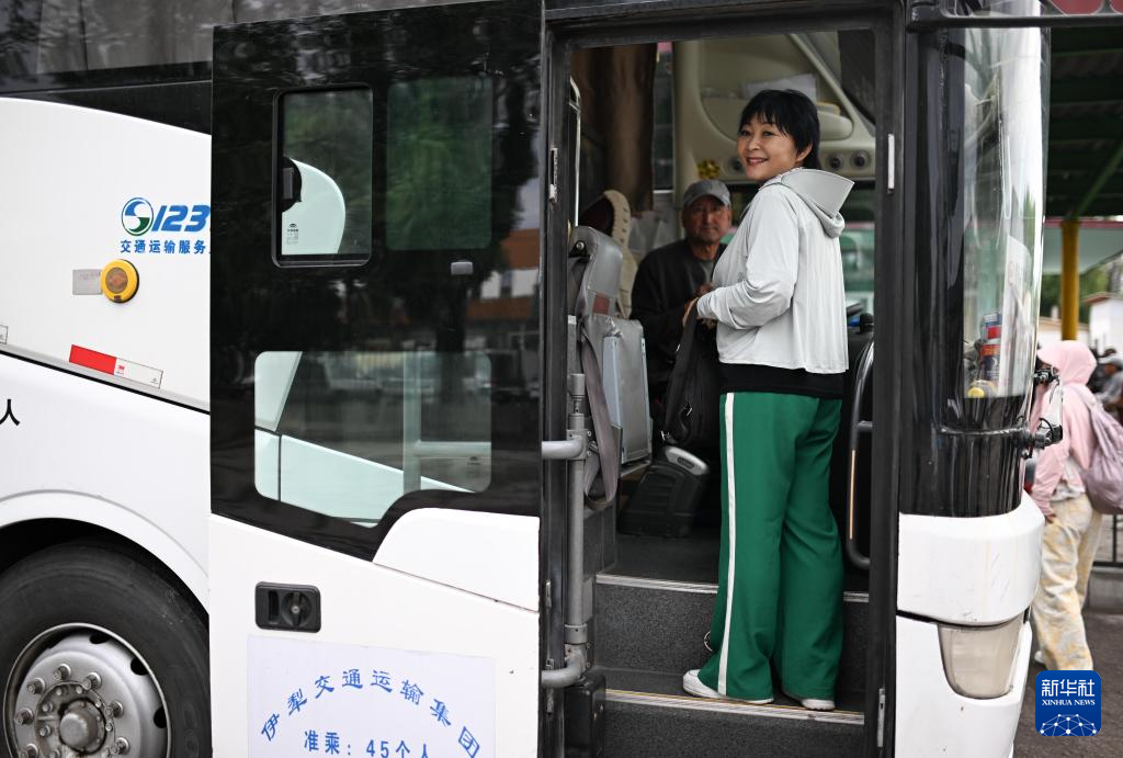 清晨,高云在哈薩克斯坦扎爾肯特鎮汽車站登上跨國客運大巴,準備返回中國(5月24日攝)。