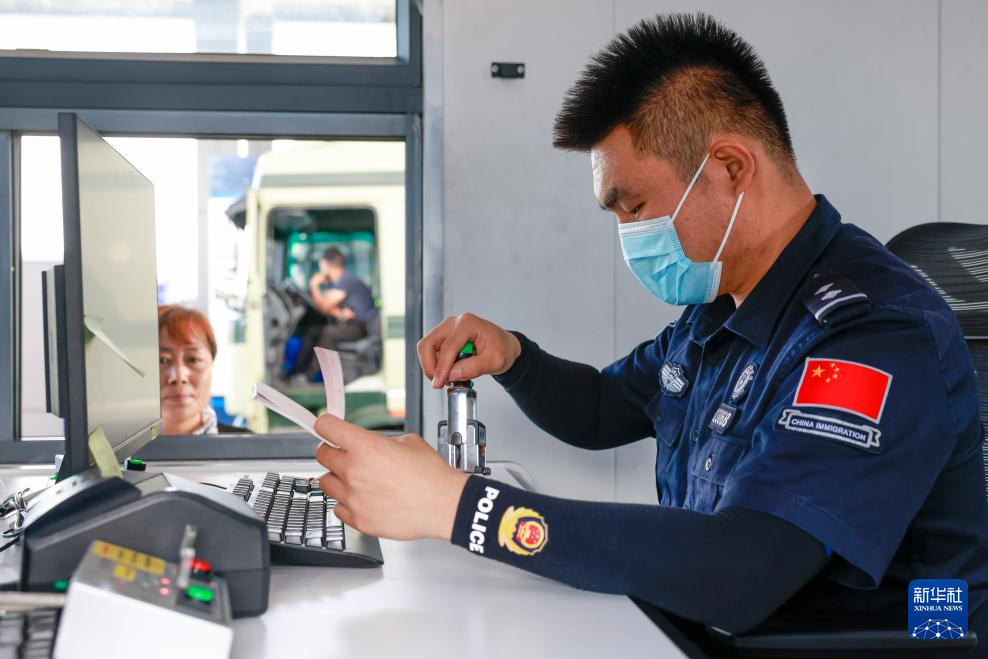 在新疆霍爾果斯公路口岸貨運執勤現場,霍爾果斯邊防檢查站移民管理警察為一名“擺渡人”辦理出境邊防檢查手續(5月28日攝)。