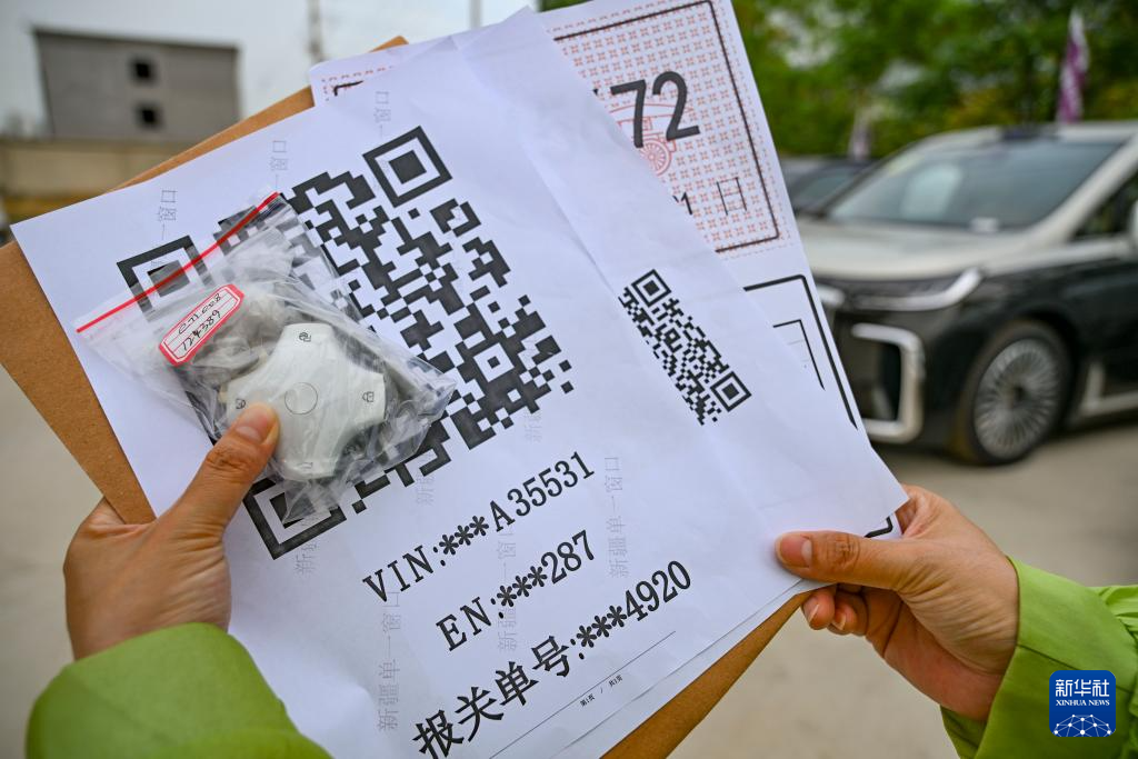 在新疆霍爾果斯一家汽車貿易公司,一名“擺渡人”展示領取到的車鑰匙和出關所需資料(6月10日攝)。2024年10月,霍爾果斯公路口岸正式運行“自駕出口商品車快速通關模式”,企業可以在線上生成包含車輛各類信息的二維碼,通關時享受“一掃即過”的便捷服務。
