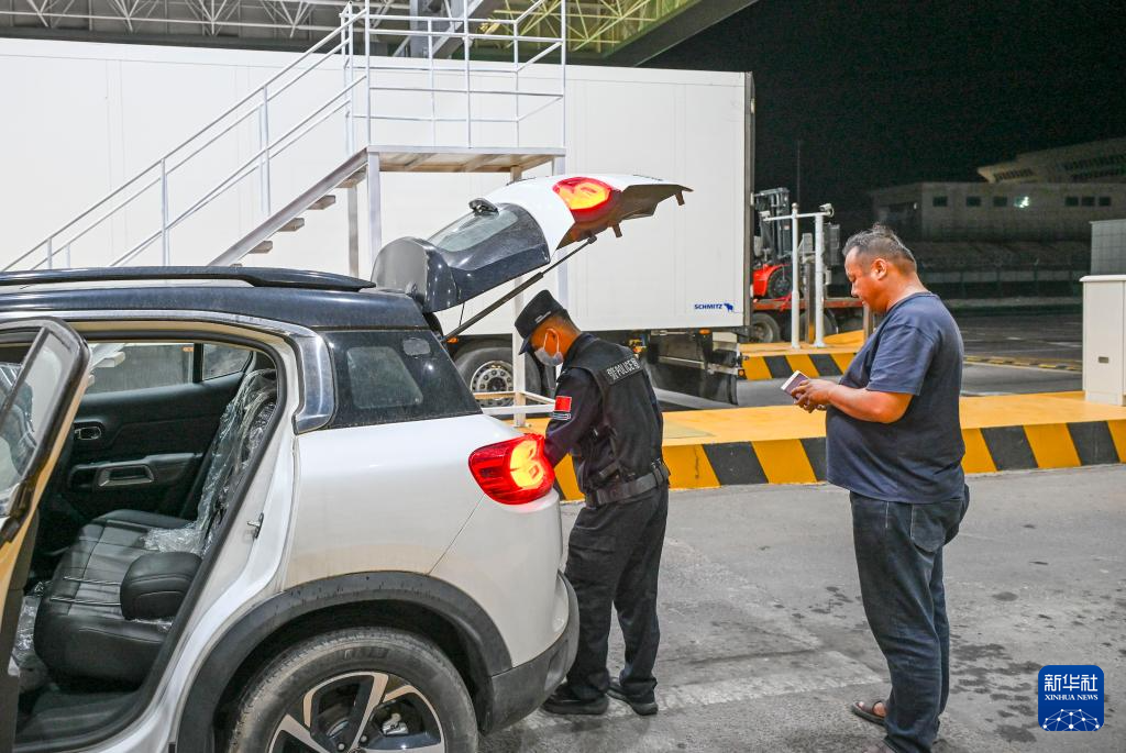 凌晨,在新疆霍爾果斯公路口岸貨運執勤現場,霍爾果斯邊防檢查站移民管理警察查驗由“擺渡人”運送出國的車輛(6月11日攝)。