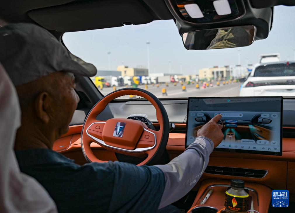 在新疆霍爾果斯市內,高云駕駛即將運送出國的新能源汽車駛向口岸(6月10日攝)。
