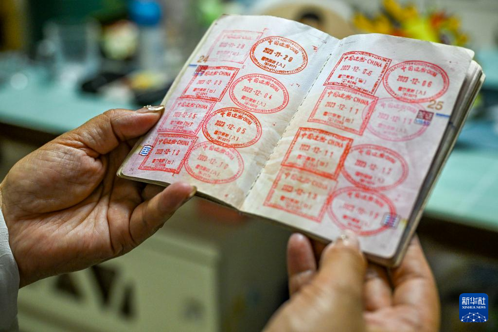 “擺渡人”高云在新疆霍爾果斯的家中展示她的第一本護照(6月9日攝)。這些出入境章記錄了她的汽車“擺渡”旅程。