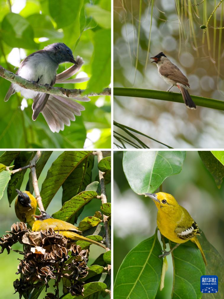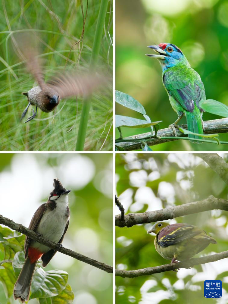 拼版照片:左上為斑文鳥;右上為藍喉擬啄木鳥;左下為紅耳鵯;右下為灰頭綠鳩(6月15日攝于中國科學院西雙版納熱帶植物園)。
