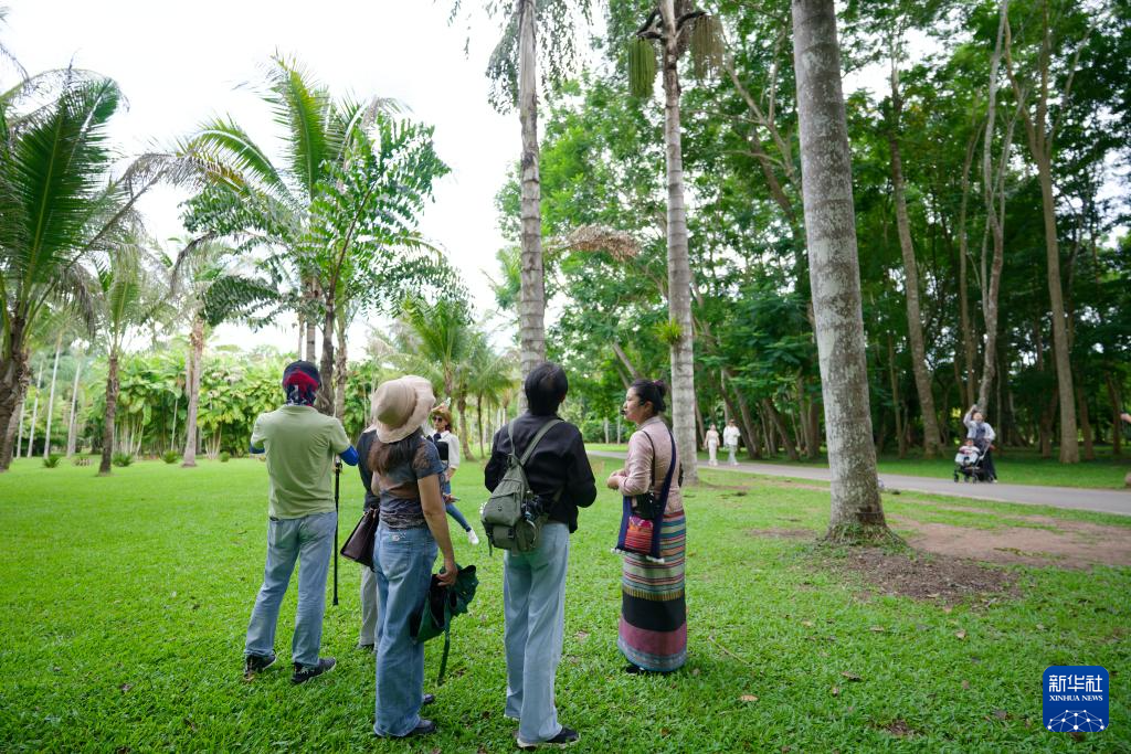 6月15日,講解員(右一)在中國科學院西雙版納熱帶植物園向游客講解熱帶雨林中常見的鳥類和植物。