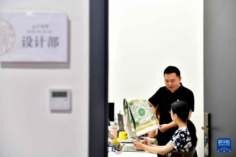 6月18日,曹縣山河錦繡漢服設計館負責人陳龍(后)與同事討論漢服設計事宜。