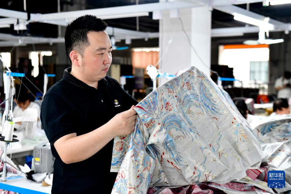 6月18日,在曹縣有愛云倉漢服基地生產車間,山河錦繡漢服設計館負責人陳龍在查看漢服面料。