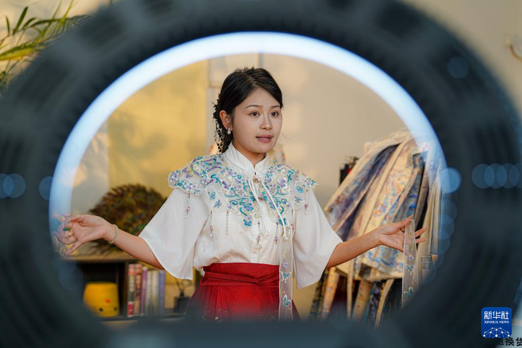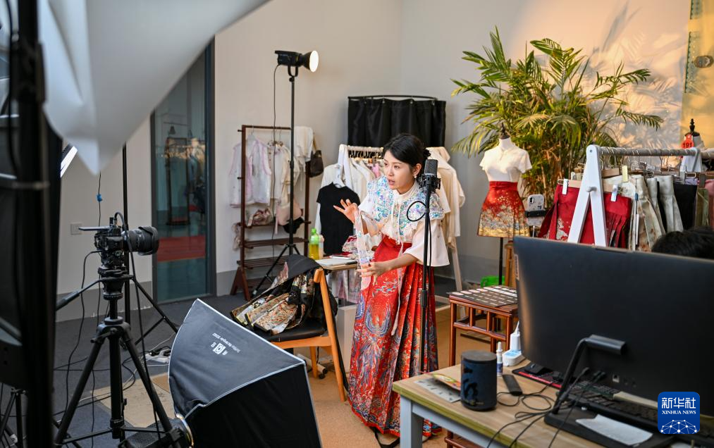 6月18日,曹縣有愛云倉漢服基地負責人姚馳行在直播推介漢服。