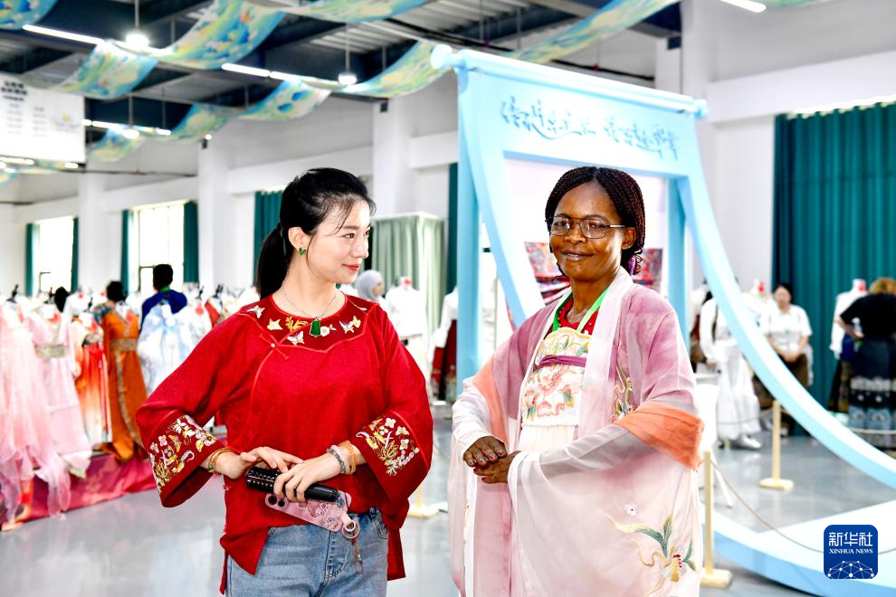 6月19日,在曹縣有愛云倉漢服基地,中華女子學院非洲法語國家婦女能力建設研修班的學員在體驗漢服。
