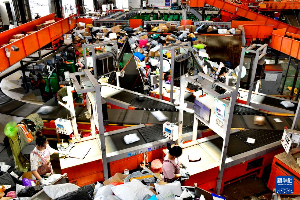 6月18日,在曹縣電子商務物流公共服務中心,工作人員在分揀快遞。