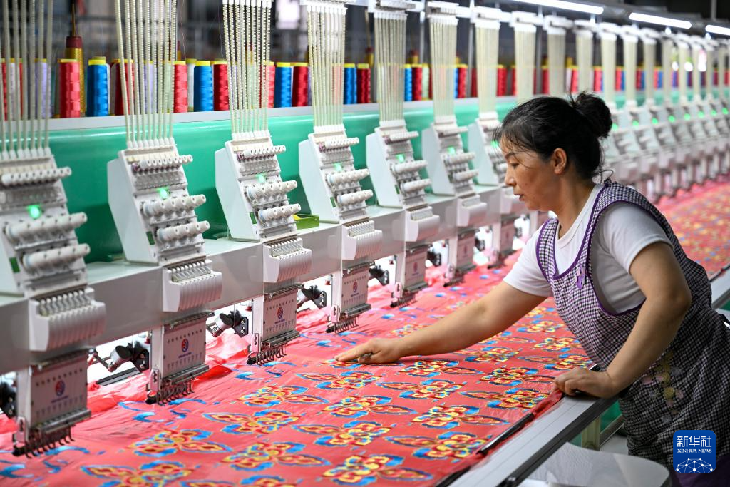 6月19日,在曹縣昌順繡花公司,工作人員查看正在繡制的布料。