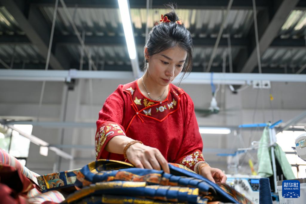 6月18日,曹縣有愛云倉漢服基地負責人姚馳行在生產車間查看馬面裙半成品。