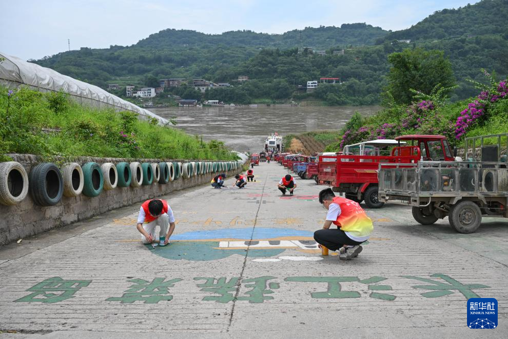 7月7日,志愿者在巴南區中壩島繪制創意圖案。