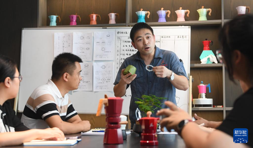 7月8日,在浙江創建廚具有限公司,研發人員討論自主研發生產的摩卡壺細節。