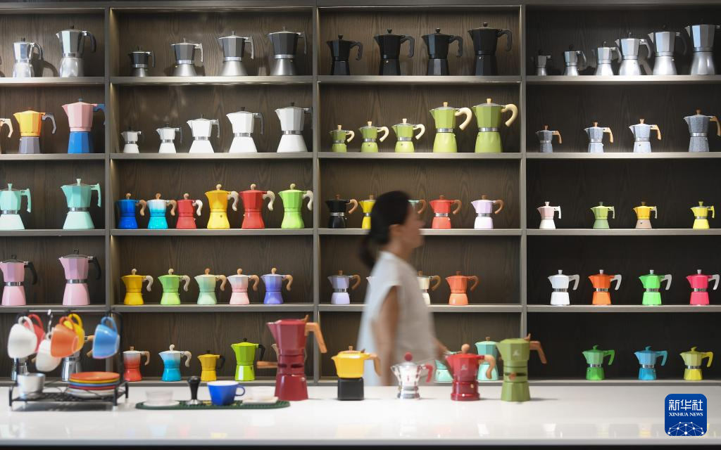 7月8日,在浙江創建廚具有限公司,工作人員走過擺放摩卡壺的展架。