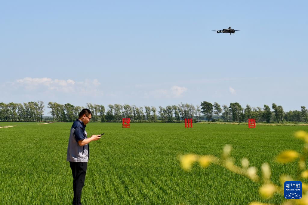 7月7日,在黑龍江北大荒農業股份有限公司八五六分公司水稻優質米“墾川香”種植基地,工作人員操控搭載多光譜、可見光攝像頭的無人機,對拔節的水稻進行葉態、葉色調查,以精準監測葉片含氮量、葉綠素和水稻長勢情況,并綜合大數據,通過AI技術形成巡田“處方圖”,指導種植戶進行下一步變量施肥作業(無人機照片)。