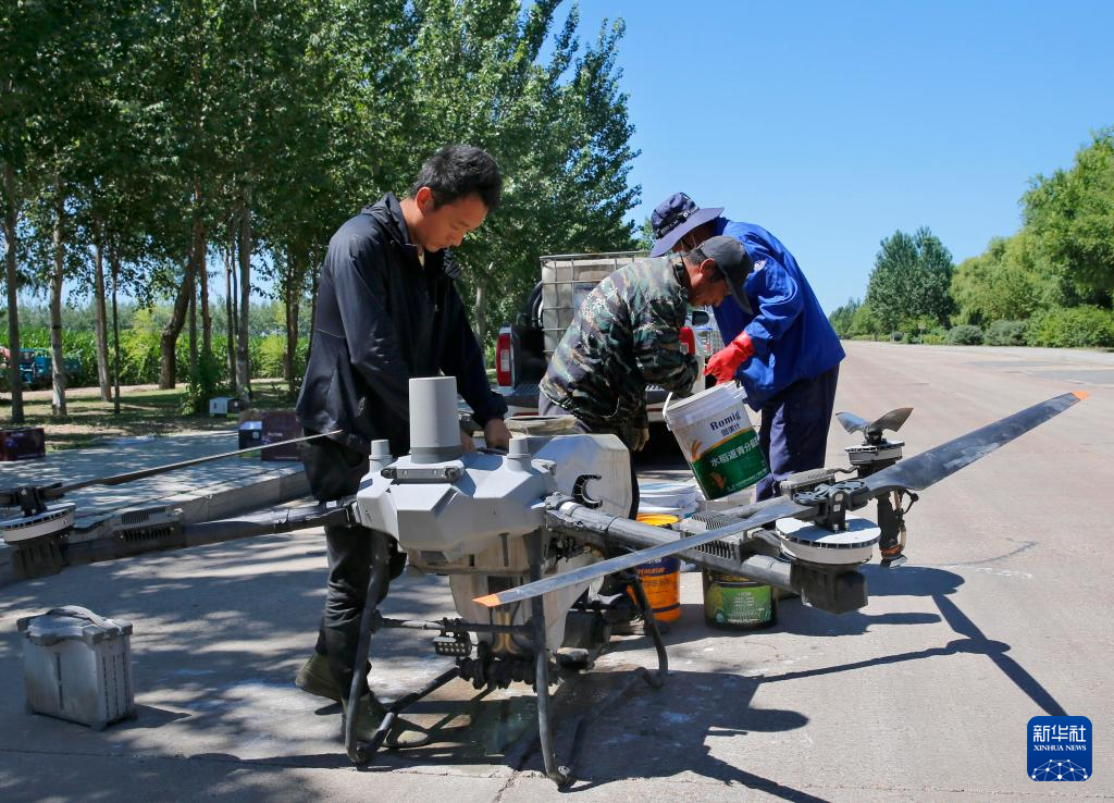 7月7日,在北大荒集團黑龍江查哈陽農場有限公司金星管理區,工作人員為農用無人機添加藥劑。