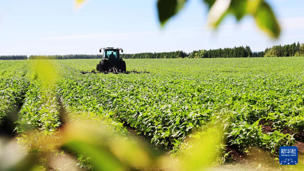 7月7日,在北大荒集團黑龍江紅星農場第一管理區有機大豆田里,搭載北斗導航系統的大馬力機車開展有機大豆二次中耕作業。