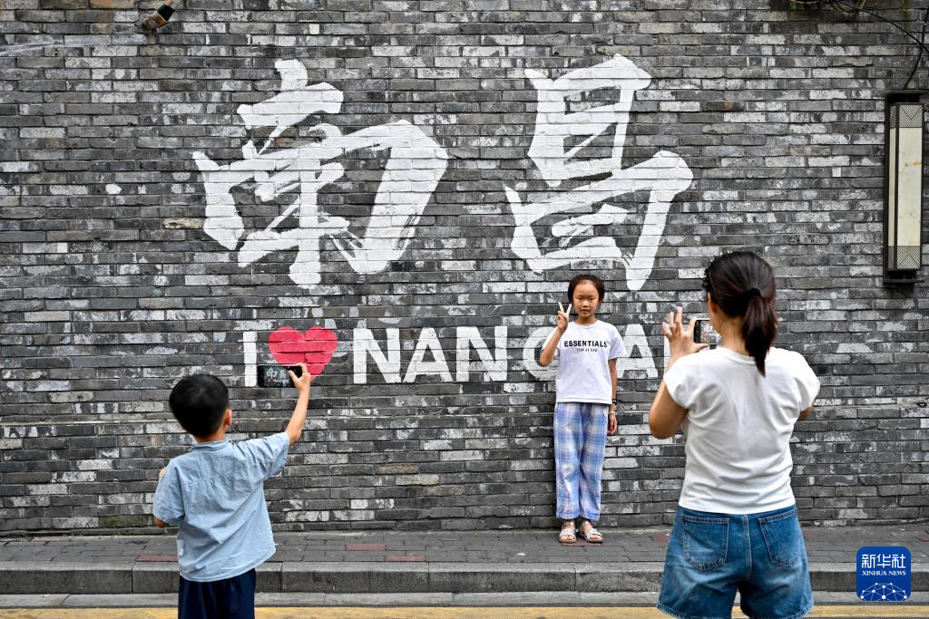 7月7日,游客在江西南昌滕王閣景區附近的半步街打卡留影。