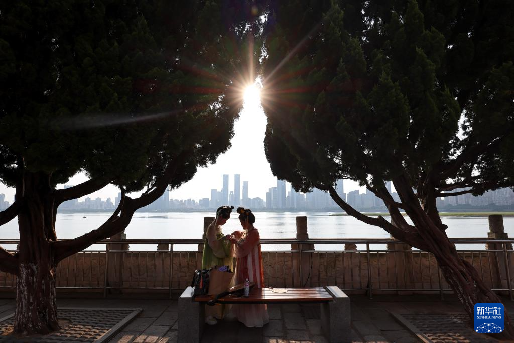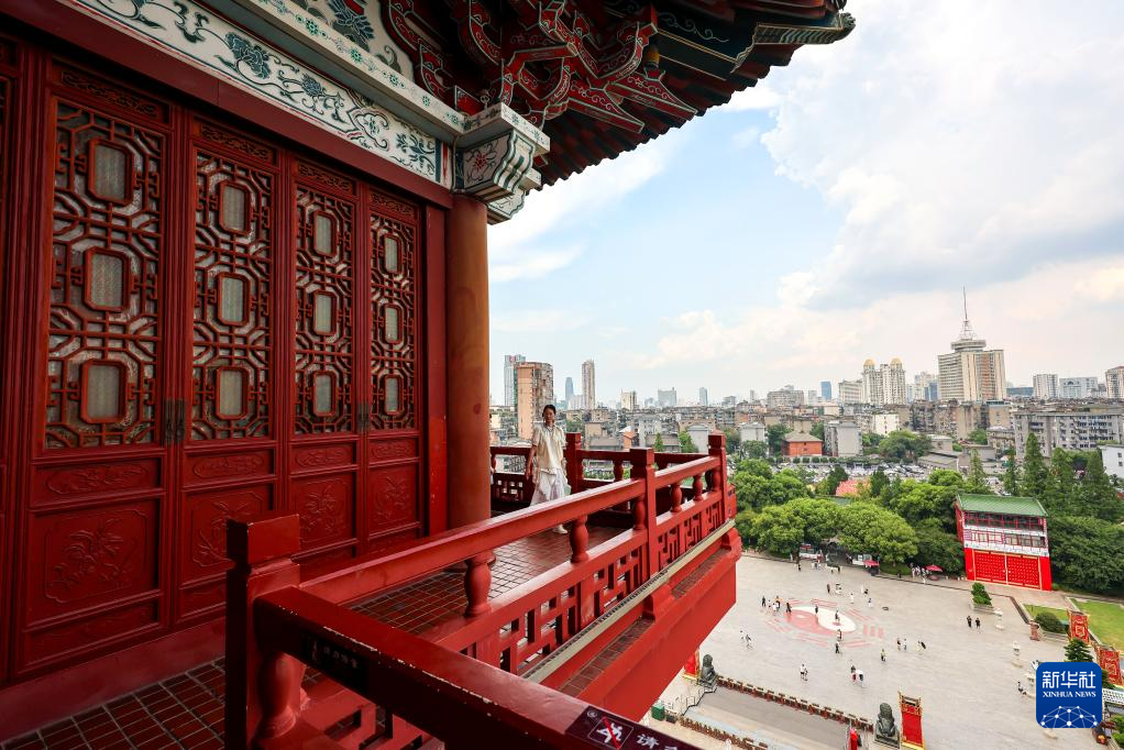 7月7日,游客在江西南昌滕王閣景區內休憩。