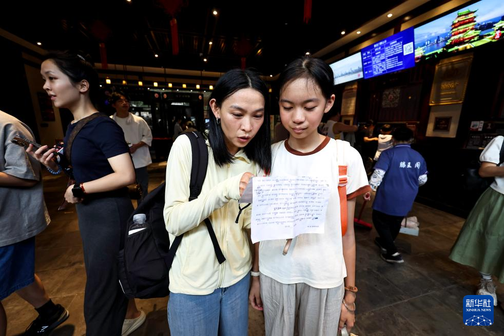 7月7日,一位來自廣東東莞的母親拿出打印好的《滕王閣序》,幫助女兒溫習鞏固,期待背誦通關。近年來,滕王閣景區推出背誦《滕王閣序》全文免門票活動,吸引了各地游客前來挑戰。