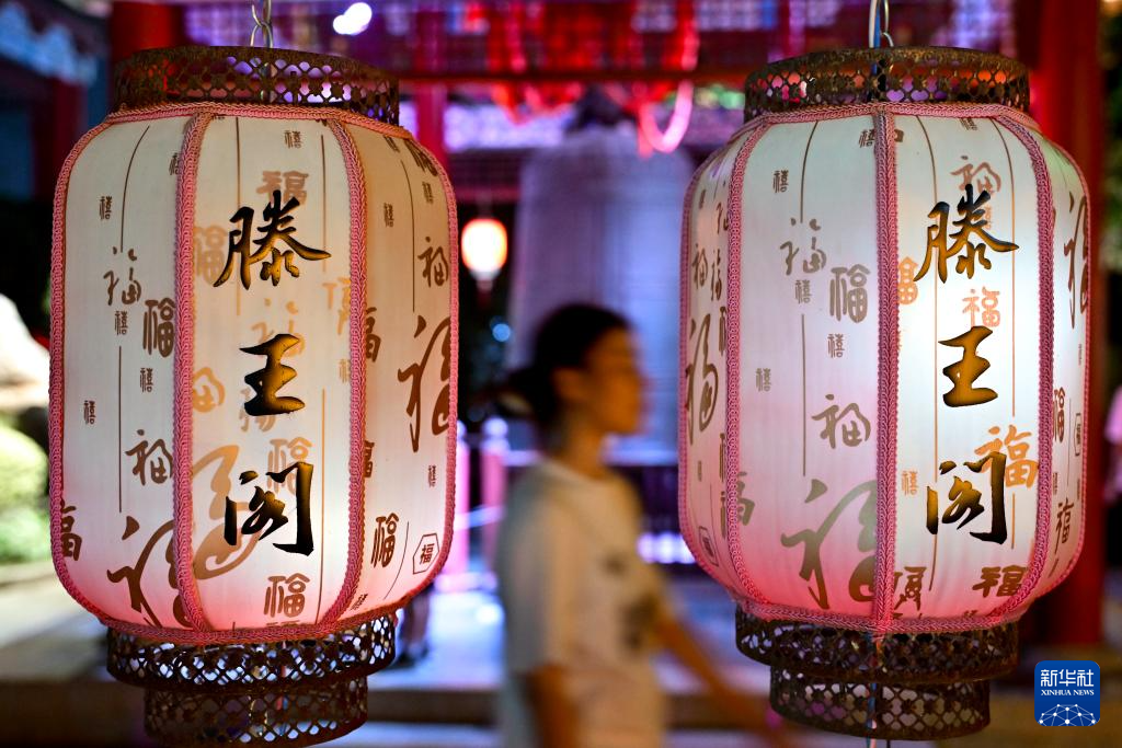 7月7日,游客在夜間游覽江西南昌滕王閣景區。