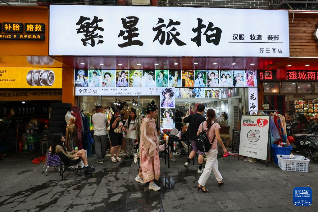 7月7日,傍晚時分,江西南昌滕王閣景區附近的一家旅拍店仍然客流不減。