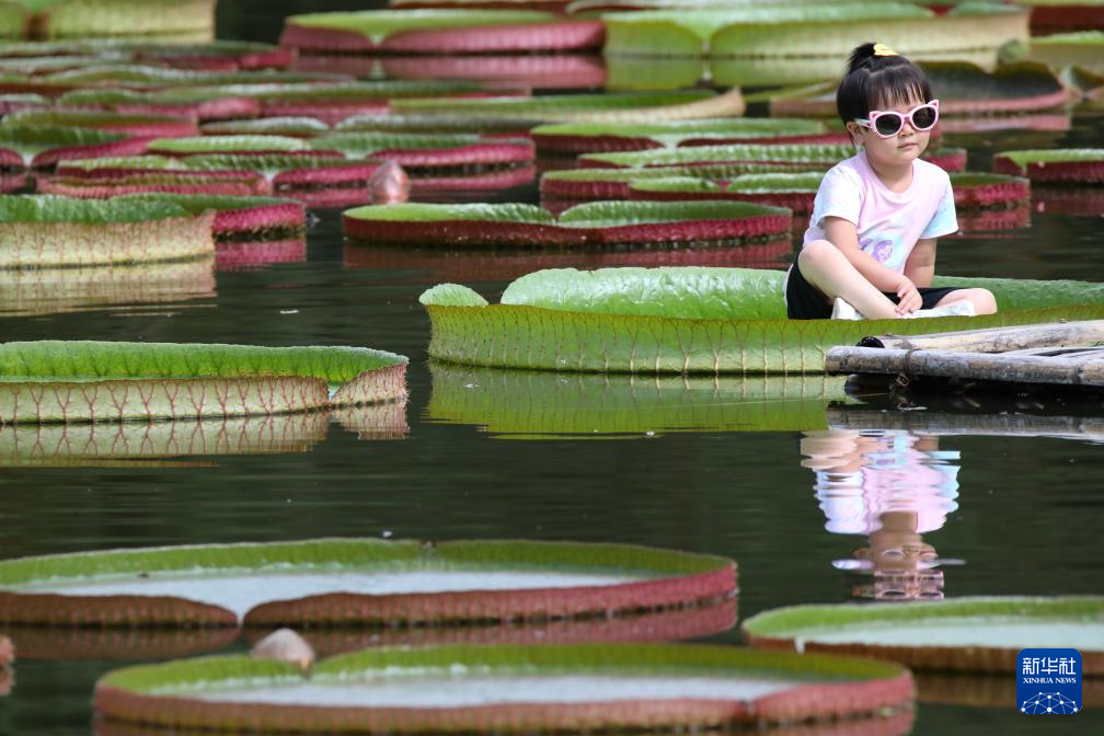 7月12日,小朋友在云南省勐臘縣的中國科學院西雙版納熱帶植物園景區體驗乘坐王蓮。