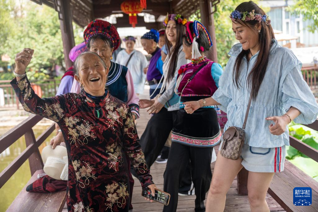 7月12日,游客在云南省文山壯族苗族自治州文山市新平社區莊子田村與當地村民一起體驗弦子舞。