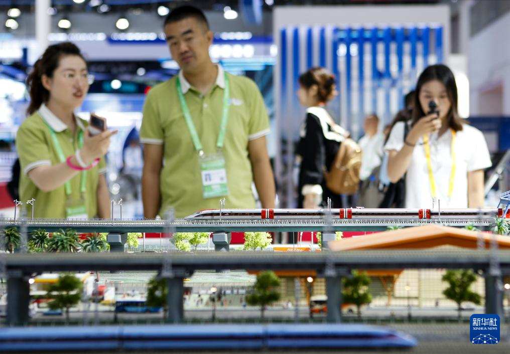 7月17日,在先進制造鏈展區中國中車展臺,參會者觀看中車高速軌道交通裝備系統沙盤。