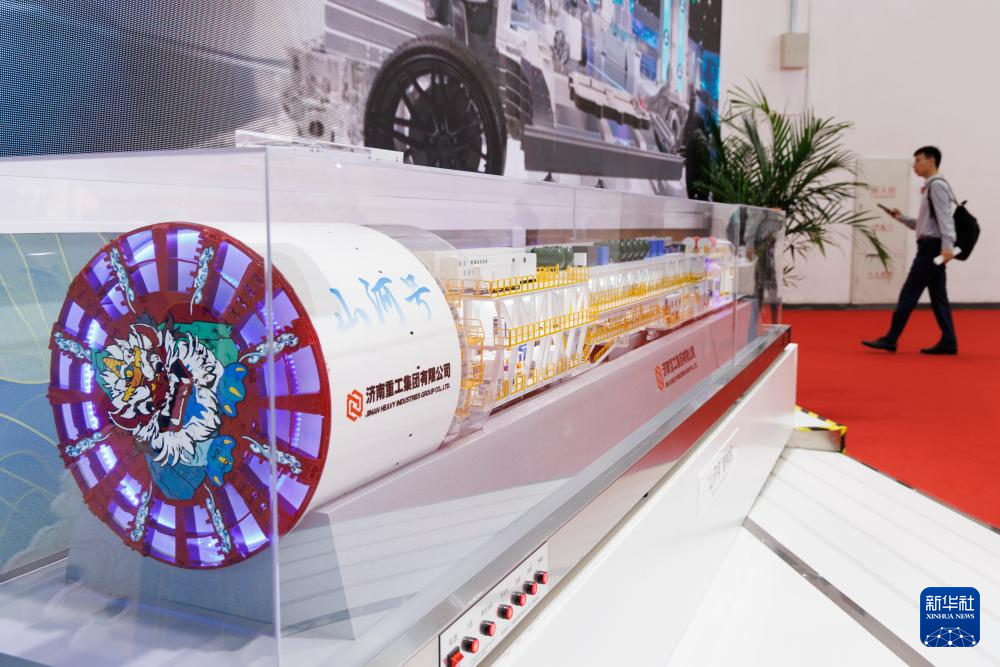 7月17日在第三屆中國國際供應鏈促進博覽會主賓省山東省展臺拍攝的“山河號”盾構機。
