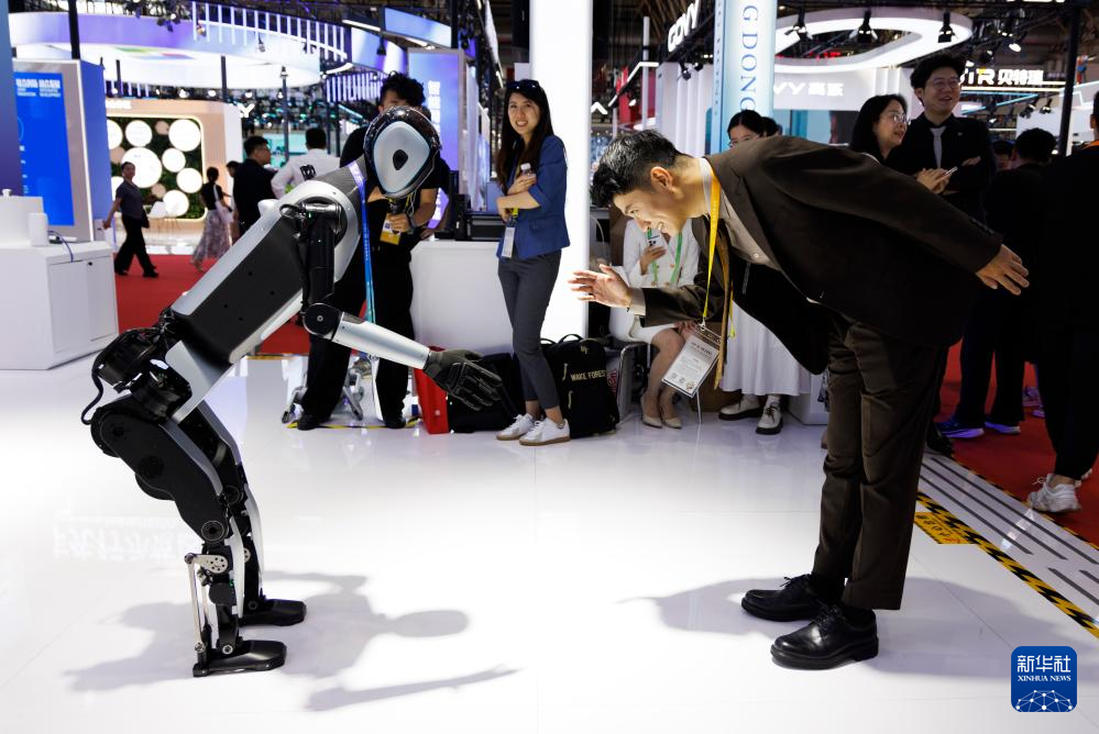 7月17日,在第三屆中國國際供應鏈促進博覽會主賓省廣東省展臺,商用版人形機器人“行者”和一位媒體記者互致問候。