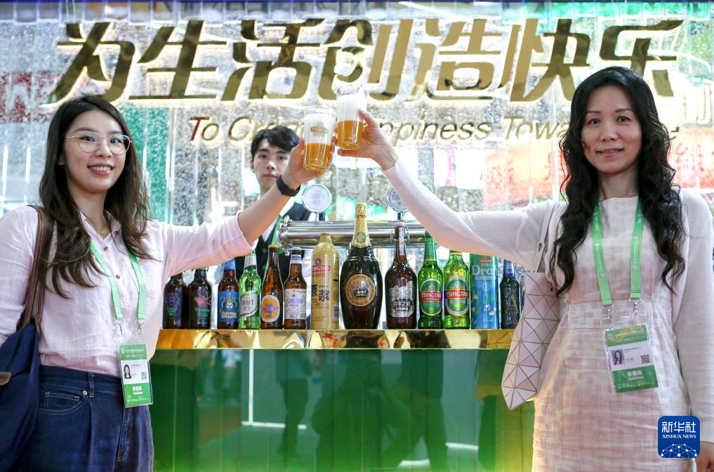 7月17日,參會者在青島啤酒展臺品嘗啤酒。