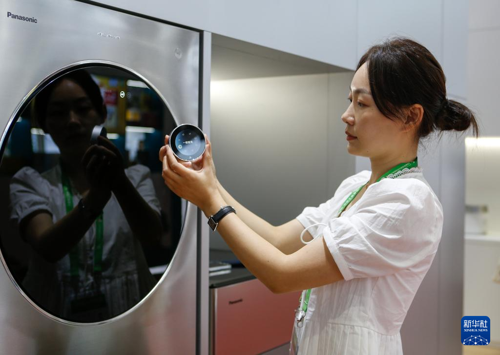 7月17日,參展商為觀眾介紹一款松下遙控洗衣機。
