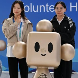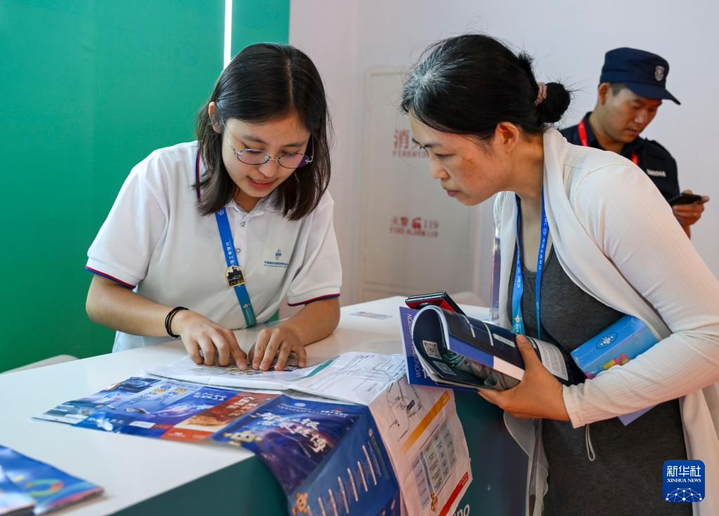 7月20日,來自北京外國語大學的志愿者(左)在第三屆鏈博會引導臺為觀眾提供服務。