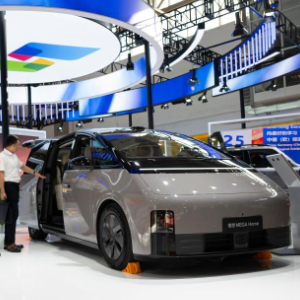 7月18日,工作人員在智能汽車鏈展區操作一款搭載自動輪智行底盤技術的樣車。