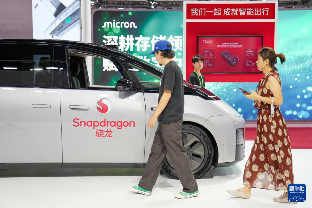 7月17日,在數字科技鏈展區高通公司展臺,參觀者在參觀搭載了驍龍數字座艙平臺的理想MEGA純電動汽車。