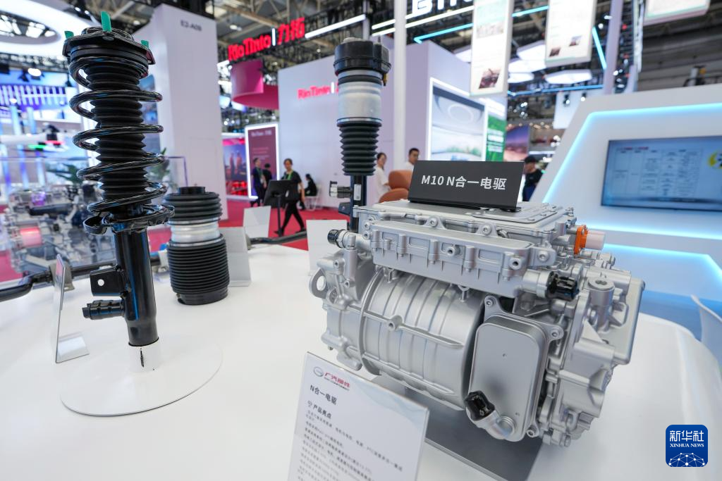 7月19日,在智能汽車鏈展區廣汽部件展臺拍攝的新能源汽車電驅和懸掛產品。