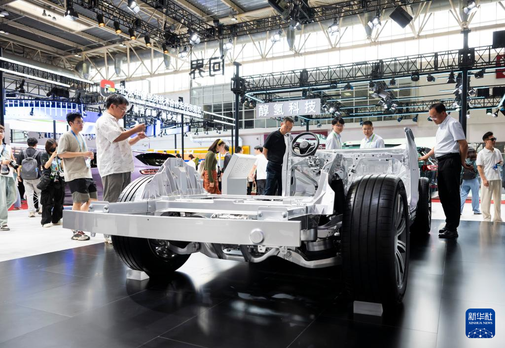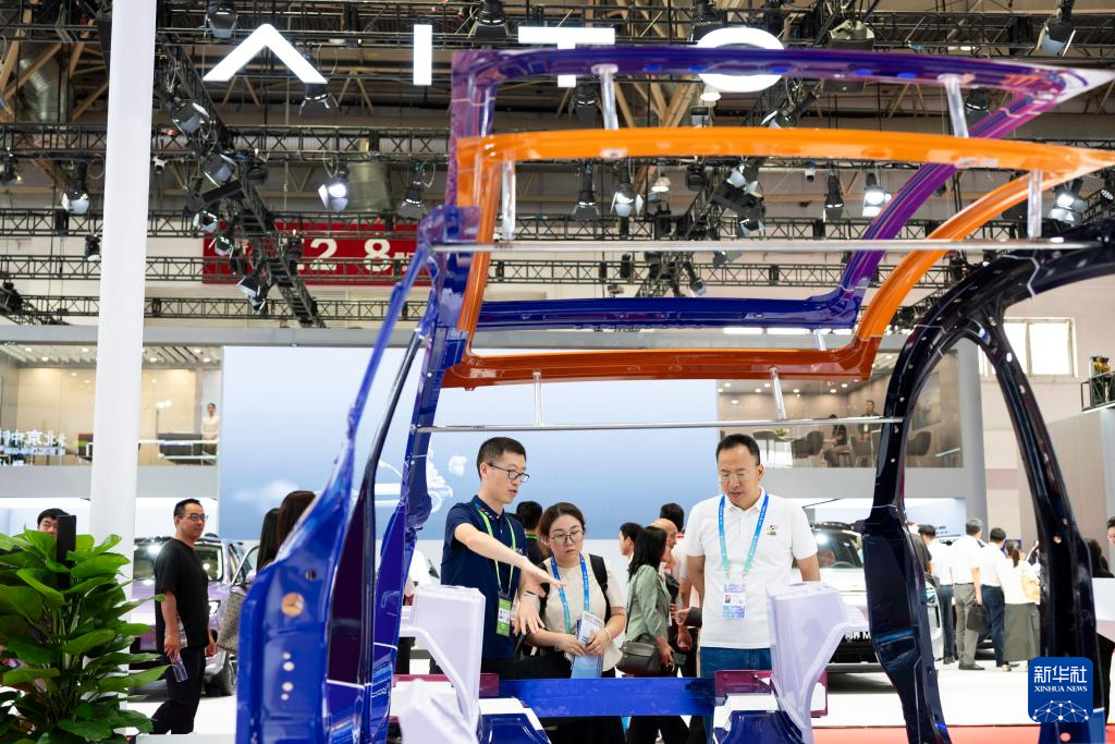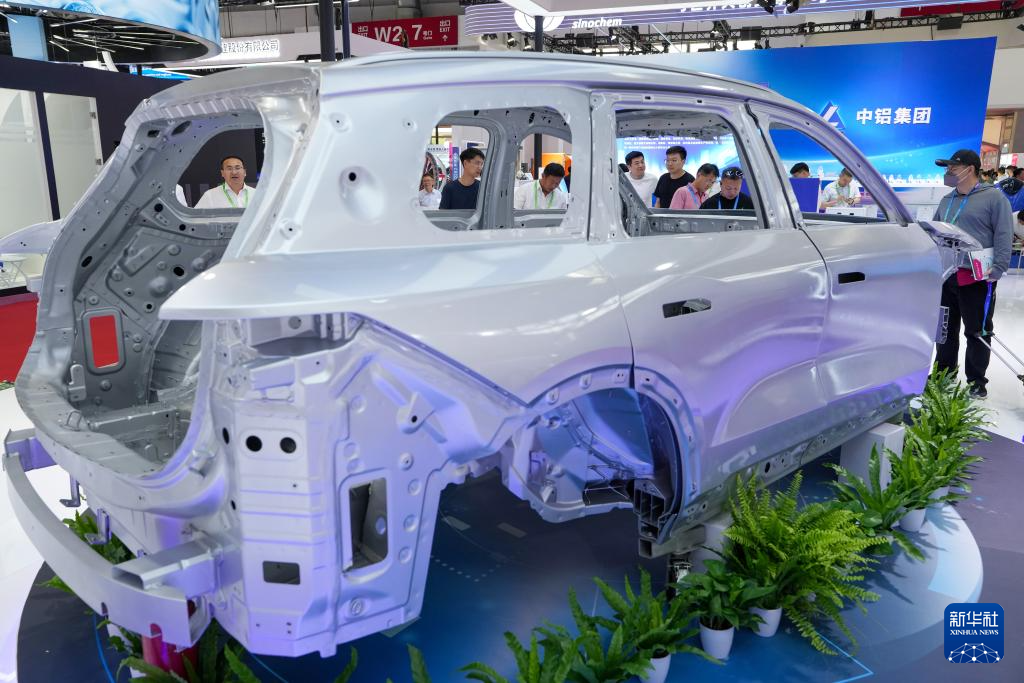 7月16日,在先進制造鏈展區中鋁集團展臺,參觀者參觀鋁制新能源汽車白車身和其他鋁制部件。