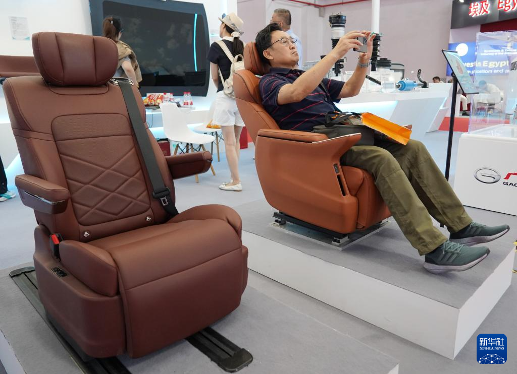 7月18日,參觀者在智能汽車鏈展區體驗一款零壓體感座椅。