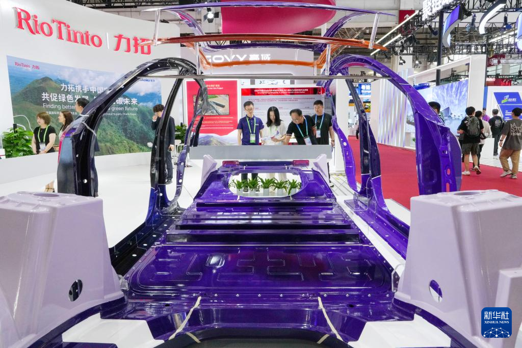 7月19日,在智能汽車鏈展區力拓公司展臺,參觀者在了解從鐵、鋁等原材料到新能源汽車白車身的全球新能源汽車產業鏈協同。