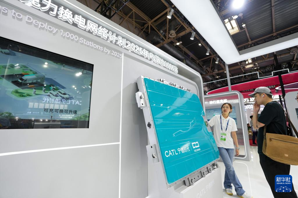 7月19日,在智能汽車鏈展區寧德時代展臺,參觀者在了解寧德時代巧克力換電塊。