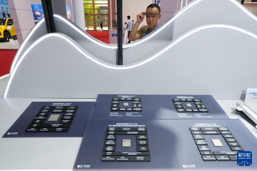 7月19日,在智能汽車鏈展區黑芝麻智能展臺,參觀者在參觀展出的輔助駕駛芯片產品。
